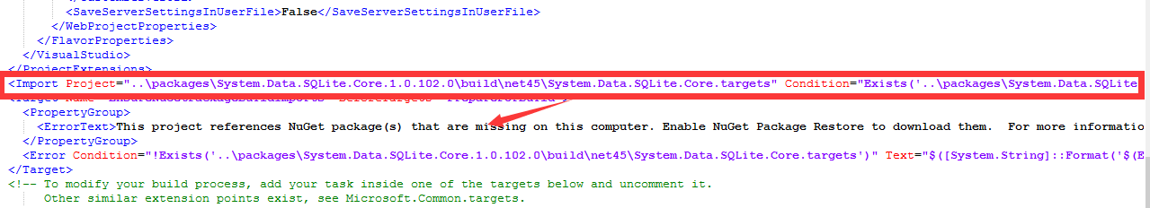 我们看到当生成解决方案时会重新加载该文件,该文件会导入SQLite但是此时我们已经删除则会出现下面的错误,此时我们将其导入和错误内容进行删除即可生成解决方案成功。我们将程序集进行如下放置: