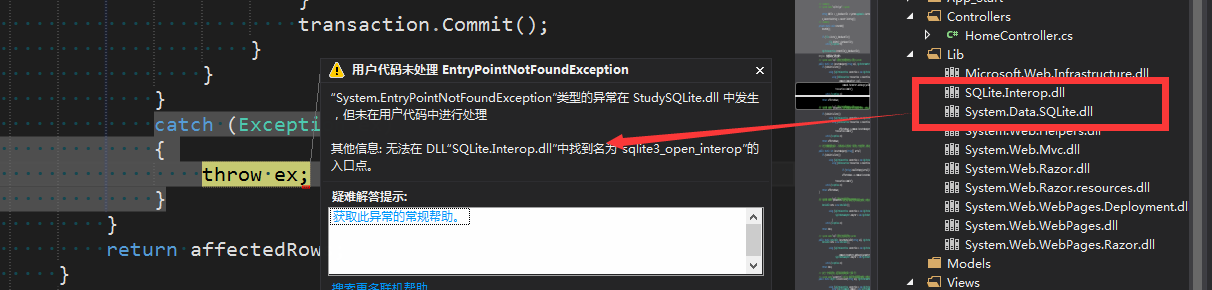 如上我们将存放【SQLite.Interop.dll】程序集的名字修改为test此时则依然出错找不到入口点。从这里可以看出存放【SQLite.Interop.dll】程序集文件夹名字要么是x86或者x64。好了,到了这里是不是就完了呢,还没有,我们一直演示的是将SQLite放在一个项目中,要是将其作为另外的一个项目又是怎样的情况呢?我们来看看。