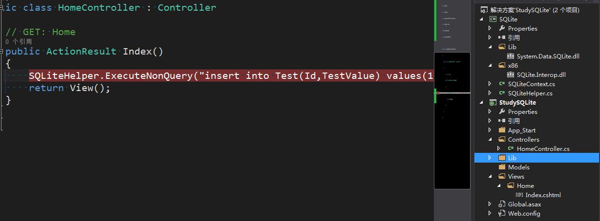 此时我们来演示第二种情况,我们建立一个空的MVC项目将上述两个SQLite程序集放在同一文件夹下我们来插入数据试试。