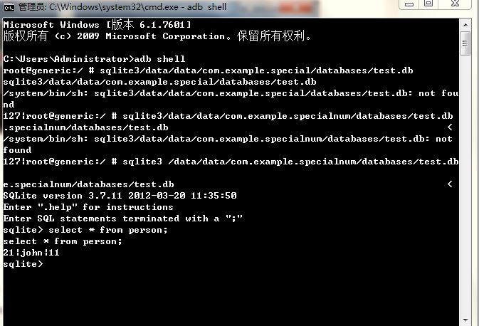 现在你可能不知道你的test.db到底在电脑里面的哪个位置,你只知道在FileExplorer中的位置是/data/data/com.example.specialnum/databases/test.db于是,在cmd中运行sqlite,就可以select到刚才上面插入的数据(21,john,11)了。