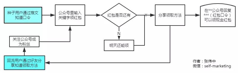 于是我们参照支付宝口令红包,做出了“公众号内回复口令领红包”的发红包方式,并据此设计了用户传播路径: