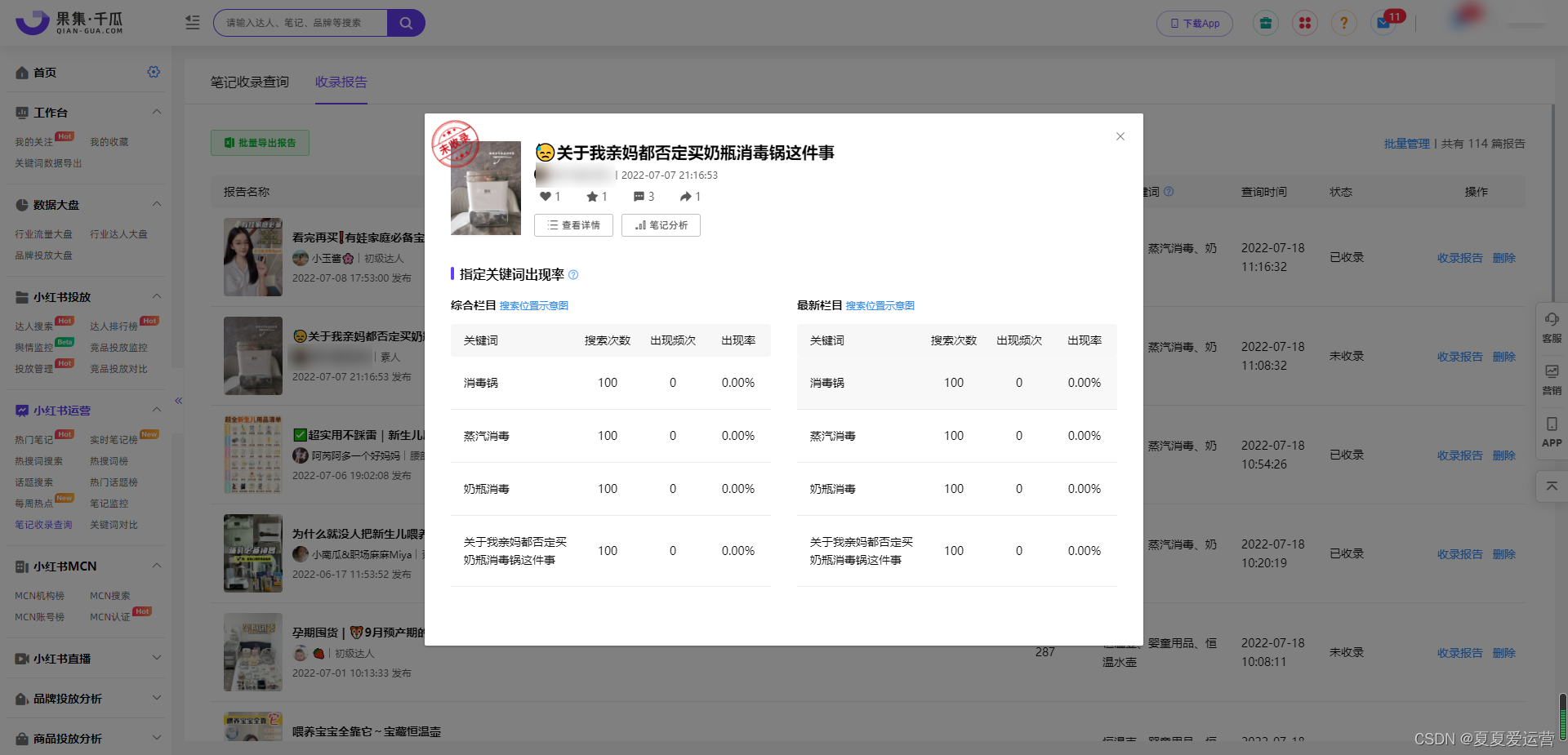 并且可以指定关键词,同时查看笔记标题和关键词的收录情况。确定添加查询后,系统将生成收录报告,检测搜索结果TOP100是否出现该笔记。
