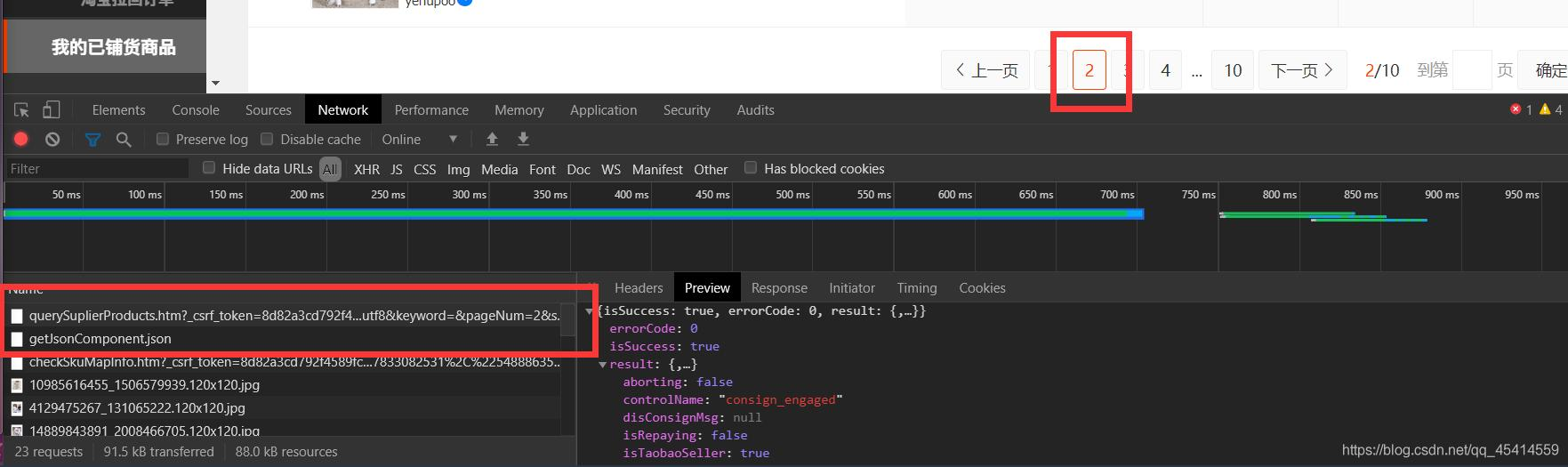 - 我们首先打开检查模式(右键检查或者键盘中F12敲一敲)。在这里我们直接进入 Network 网络传输这里。如果这里为空不用担心,因为刷新一下传输太多了咱们看不过来,我们直接点击下一页点到第一个传输位置,我们会发现 Preview 里面有我们的json信息,pageList 能看到卖货信息全在这里。那就容易了,记住这个 url 请求地址就好。