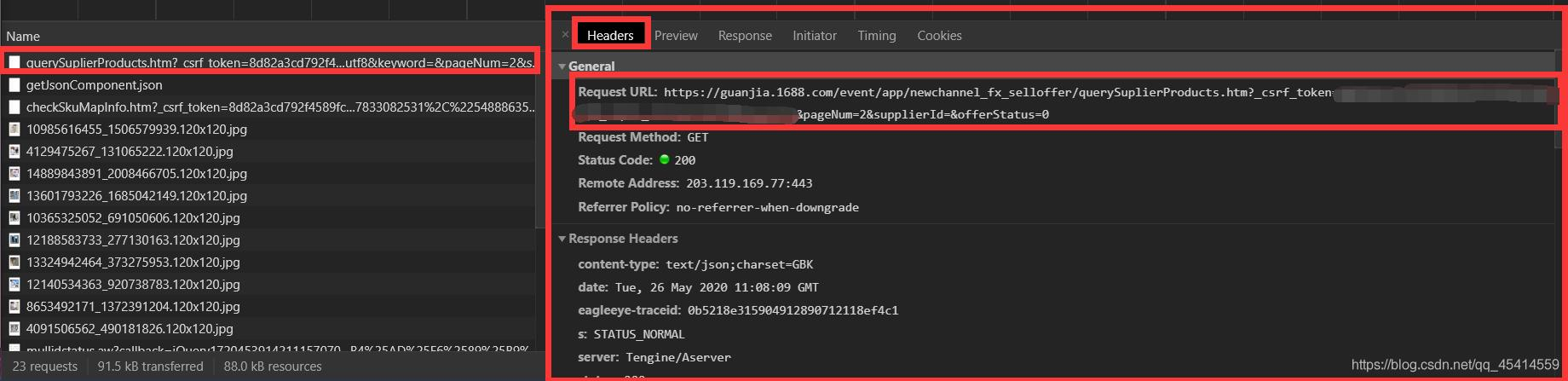 url 地址怎么获取:还是刚才那个第一个别变,我们直接找Headers信息找到第一项 Request URL 就是我们需要的那个网站信息,这个网址非常乱。如果你不想了解爬虫的话看不懂无所谓。其实这个就是你淘宝账号的key信息,属于你自己一个人的网址链接。我们只需要看到 pageNum=2 参数,就大概能猜到这个是你当前的页数了。(PS:一开始我以为我还得自己去寻找一共多少页信息,结果我发现这个Json里面全都包括了?淘宝牛皮!)