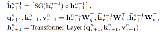 形式化的描述,假设模型包含 n n n 层隐层,当前是第 τ tau τ 个分段,每个分段长度为 L L L 。则第 n n n 层 τ + 1 tau +1 τ+1 个分段的隐状态向量可计算为: