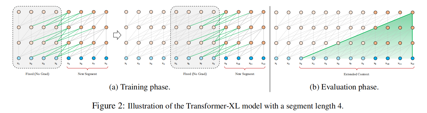 SG 表示无梯度。上面说了,前一个片段只能保留对应的隐状态,但无法实现梯度传递,因此在当前segment的训练时,无须计算这个梯度。整个计算可视化如下图(a):