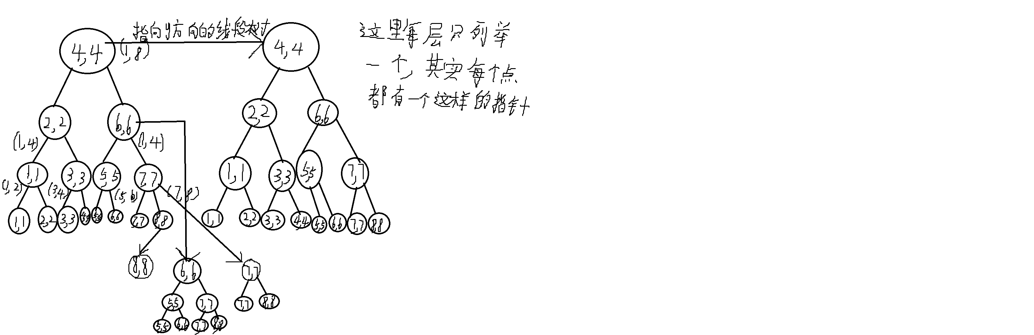 例如2,8 1,5 3,3 4,4 5,7 6,2 7,1 8,6,如果直接对y方向从小到大排序,得到的是7,1 6,2 3,3 4,4 1,5 8,6 5,7 2,8,这样子叶子2,8对应y维度的树就成了7,1了,其实叶子结点,两个维度肯定是完全相同的。