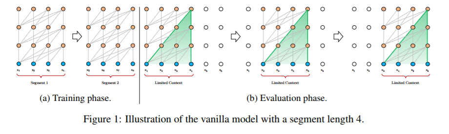 一个可行但粗糙的近似方法是将整个语料库分割成易处理大小的较短片段,仅仅用 每个片段来训练模型,忽略以前段中的所有上下文信息。这个想法 被Al-Rfou采纳。我们称他为 通用模型,直观的图如Fig1.a。在这种训练模式下,信息在向前或向后的传递过程中都不会跨段流动。使用固定长度上下文有两个关键限制。首先,最长的可能依赖长度是由分段的长度限制,这是字符级语言建模上的几百个长度。因此,虽然self-attention 机制 相对于Rnns 受到梯度消失的影响更小,但是 通用模型 不能充分利用这种优化优势。第二,虽然可以用padding来关注 句子或者其他语义边界,但是实际上为了效率 标准做法是 将长文本简单地分成固定长度的段。然而简单的 将长文本简单地分成固定长度的段将会导致 section1讨论的上下文碎片问题。