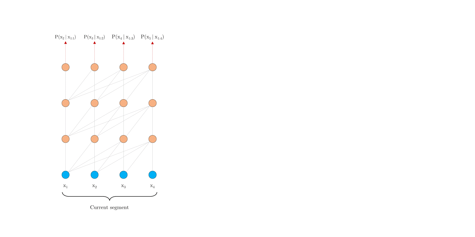 - 一个近似的方法:将整个语料库切分为更短的段,并且仅仅在每个段内进行训练,在每个段中忽略前一个段的信息。这是论“Character-level language modeling with deeper self-attention”中的做法,称改论文中的Transformer为Vanilla Transformer如下图所示: