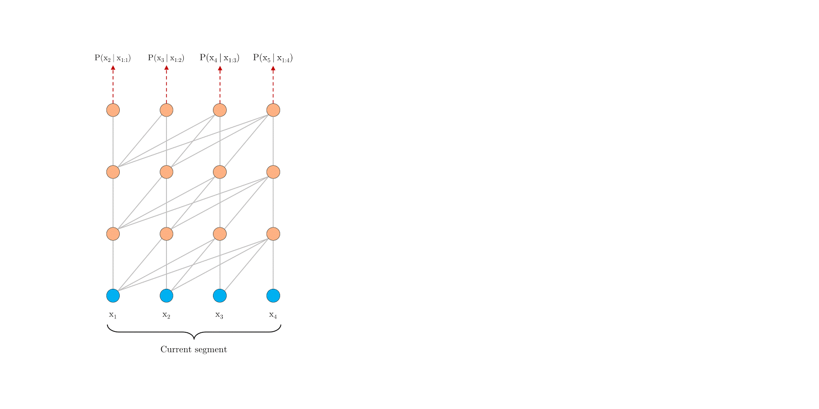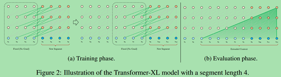 - 在训练期间,处理每个段后,我们将其所以固定长度隐藏层状态序列存储起来,用来在处理下一段时作为上下文信息扩展。但是从图上我们可以看到:每个位置都只拿其前面segment_length个词的隐藏层状态向量做上下文信息。但是我们知道这个范围的隐藏层状态向量也包含了前面不再这个范围的上下文信息,因此它能够建模长期依赖信息,并且避免上下文碎片。