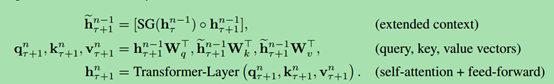 - 循环架构仅限于相邻两段之间。理论上,在GPU内存允许的条件下,可以缓存多个先前段的隐藏层状态序列,并在处理当前段时将所有段重用为额外的上下文。 在论文的实验中训练期间只缓存一段,在测试期间缓存多段。同时我们将缓存的序列统一记为: m t n ∈ R M × d m_t^n∈R^{M×d} mtn∈RM×d其中M是段长的倍数。