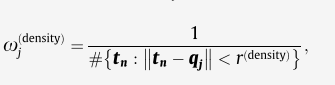 - 对于点集的除特征点外所有的点,计算两个权重,分别是 ω j ( d e n s i t y ) omega_j^{(density)} ωj(density), ω j d i s t a n c e ) omega_j^{distance)} ωjdistance)