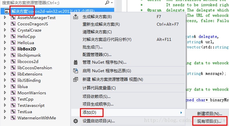回到VisualStudio2012,在解决方案上点击右键,点添加->现有项目