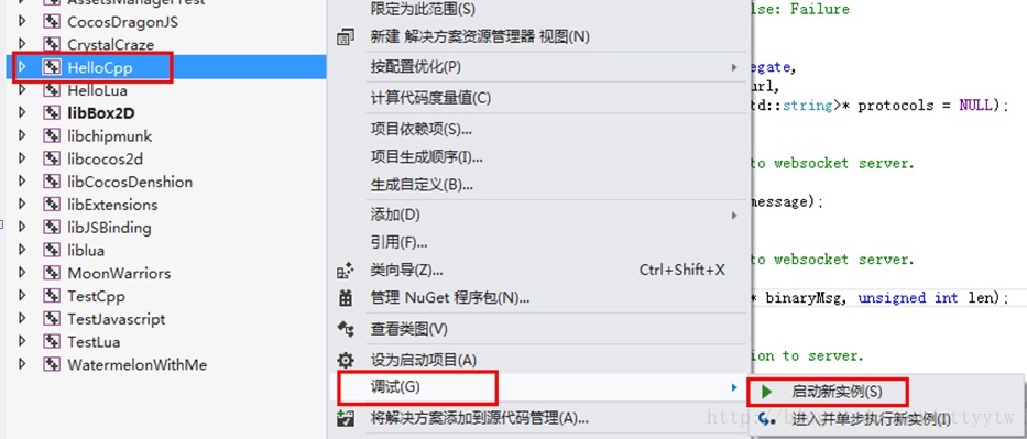 在HelloCpp项目上面点击右键,然后选择调试->启动新实例