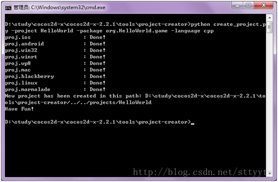 安装完毕,我们接下来使用python命令创建自己的cocos2d-x工程。