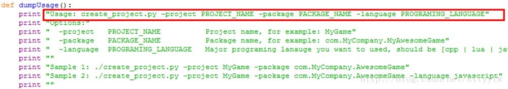 接下来使用python创建工程。进入cocos2d-x-2.2.1目录下的tools->project-creator,大家可以看到有一个create_project.py脚本,如果有兴趣的童鞋可以右键在IDE中打开来看看,从中可以截取到该脚本的使用方法