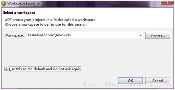 接着运行adt-bundle-windows-x86_64-20131030eclipse下的eclipse(ADT自带Eclipse编译环境),选择工程文件夹,这里可以随意配置
