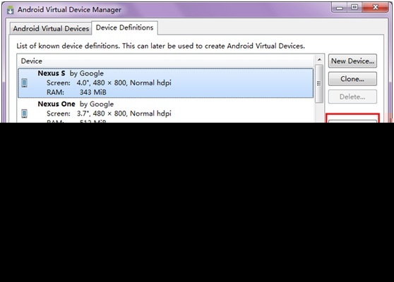 然后选择DeviceDefinitions,随便选择一个创建,好像是现在的VDM不支持OpenGL的高版本,所以我使会用BlueStacks模拟器来调试,这里只是生成apk