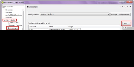 然后选择C/C++Build->Environment->Add