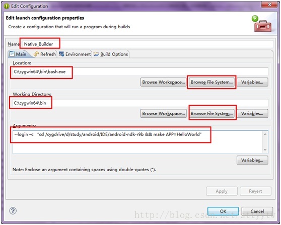Arguments栏输入:--login-c "cd /cygdrive/d/study/android/IDE/android-ndk-r9b &&make APP=HelloWorld"