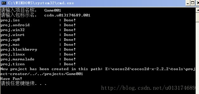 看到里面的各种Done!的提示语后,就可以在cocos2d-x目录下的project里面看到新建的工程项目了!