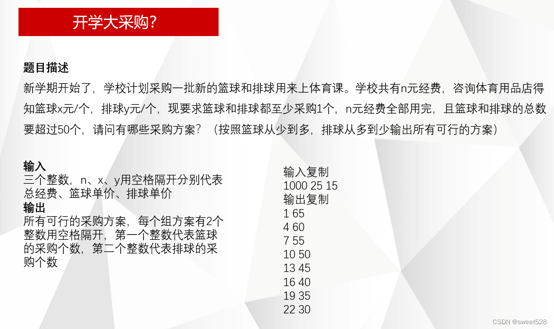 cout<<"篮球"<<i<<" "<<"排球"<<(n-x*i)/y<<endl;