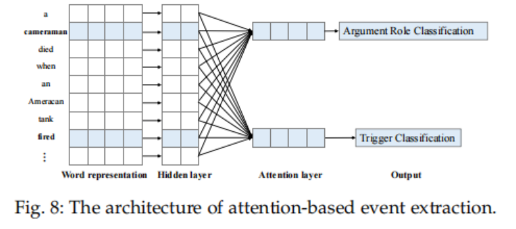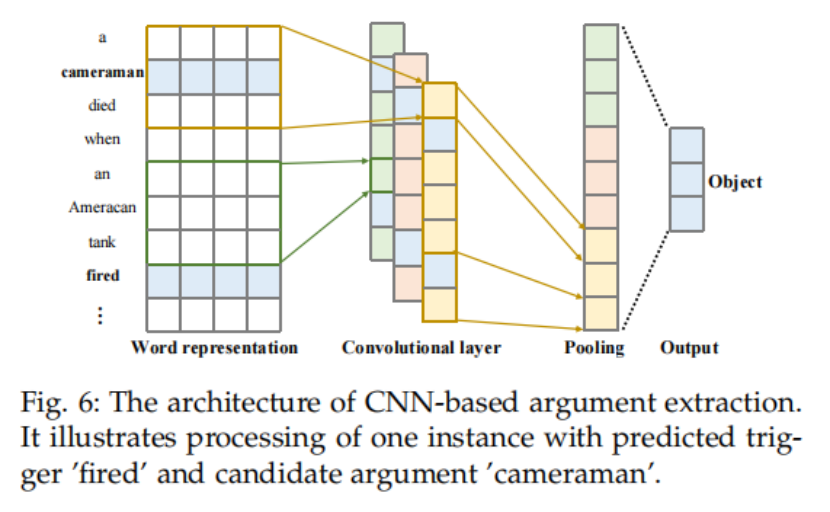 CNN归纳出句子中k-gram的基本结构。因此,一些研究人员还研究了基于卷积神经网络的事件提取技术。Nguyen等人[114]使用CNN来研究事件检测任务,与传统的基于特征的方法相比,它克服了复杂的特征工程和错误传播限制。但它广泛依赖其他受监督的模块和手动资源来获取特征。在跨域泛化性能方面,它明显优于基于特征的方法。此外,为了考虑非连续的K-G,Nguyen等人(111)引入了不连续的CNN。CNN模型通过具有丰富局部和全局特征的结构化预测应用于基于流水线(pipeline)和基于联合的范式,以自动学习隐藏的特征表示。与基于流水线(pipeline)的方法相比,基于联合的范式可以缓解错误传播问题,并利用事件触发器和元素角色之间的相互依赖性。