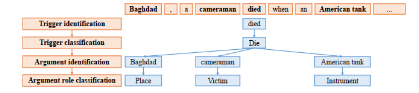 事件提取具有大量的工作价值,是一种相对成熟的研究分类法。它从文本中发现事件提及,并提取包含事件触发器和事件参数的事件。事件提及是指包含一个或多个触发器和参数的句子。事件提取需要识别事件、对事件类型进行分类、识别元素以及判断元素角色。触发器识别和触发器分类可分为事件检测任务。参数标识和参数角色分类可以定义为一个参数提取任务。触发器分类是一个多标签分类]任务,用来对每个事件的类型进行分类。角色分类任务是一种基于单词对的多类分类任务,确定句子中任意一对触发器和实体之间的角色关系。因此,事件提取可以依赖于一些NLP任务的结果,如命名实体识别(NER)、语义解析和关系提取。