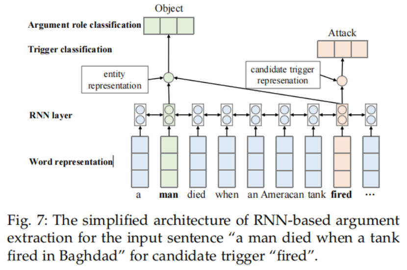 除了基于CNN的事件提取方法外,还对RNN进行了一些研究。RNN用于建模序列信息,以提取事件中的元素,如图7所示。JRNN提出了一种双向RNN,用于基于联合的范例中的事件提取。它有一个编码阶段和预测阶段。在编码阶段,它使用RNN来总结上下文信息。此外,它还预测了预测阶段的触发和论证。