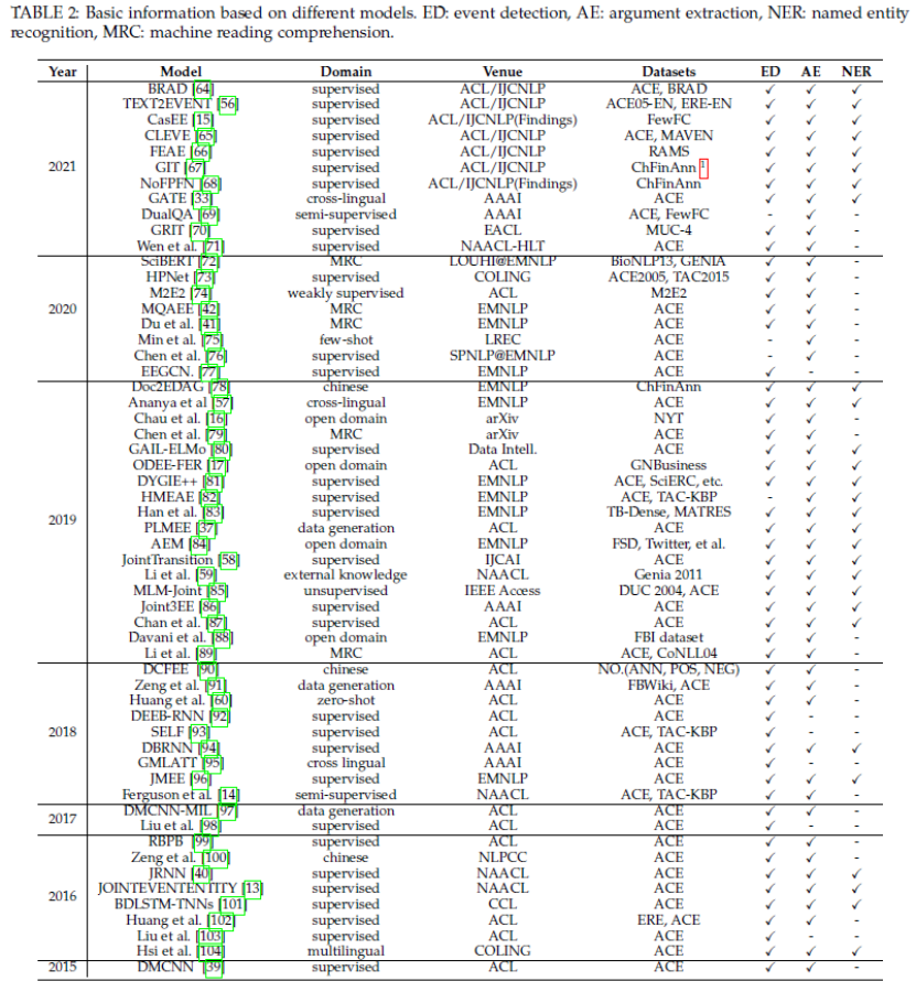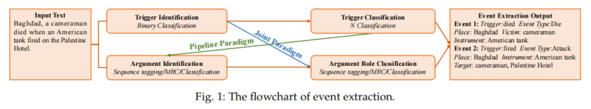 上图是事件抽取的流程图。事件提取是找到焦点事件类型,并用它的角色提取其元素。对于pipeline范例事件提取,有必要区分给定文本的文本中的事件类型,称为触发器分类。针对不同的事件类型,设计了不同的事件模式。然后,根据模式提取事件元素,包括元素识别和元素角色分类子任务。在早期阶段,论点提取被视为一个词分类任务,并对文本中的每个词进行分类。此外,还有序列标记、机器阅读理解(MRC)和序列到结构生成方法。对于联合范例事件提取,该模型同时对事件类型和元素角色进行分类,以避免触发分类子任务带来的错误。