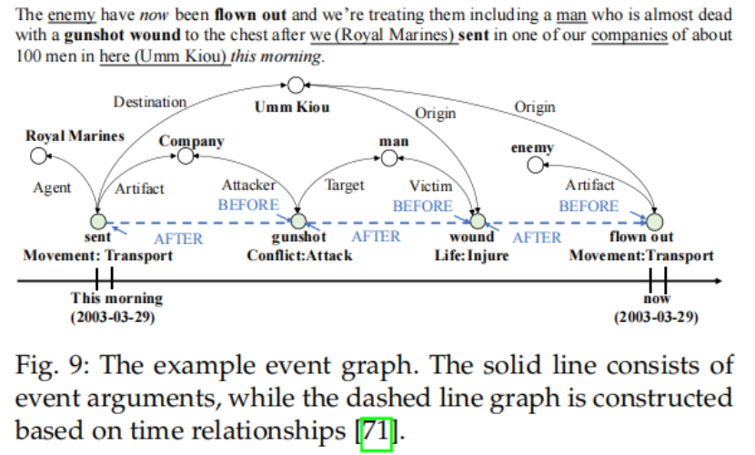 在(《Event time extraction and propagation via graph attention networks》)中,TAC-KBP时隙用于填充任务中提出的四元时间表示,该模型预测事件的最早和最晚开始和结束时间,从而表示事件的模糊时间跨度。该模型基于共享元素和时间关系为每个输入文档构建文档级事件图,并使用基于图的注意网络方法在图上传播时间信息,如图所示,其中实体加下划线,事件用粗体显示。Wen等人基于输入文档的事件关系构建文档级事件图方法。将提取文档中的事件元素。然后,根据关键字(如前后)和事件发生的时间逻辑,按时间顺序排列事件。实体元素在不同事件之间共享。模型实现将事件合并到更准确的时间线中。