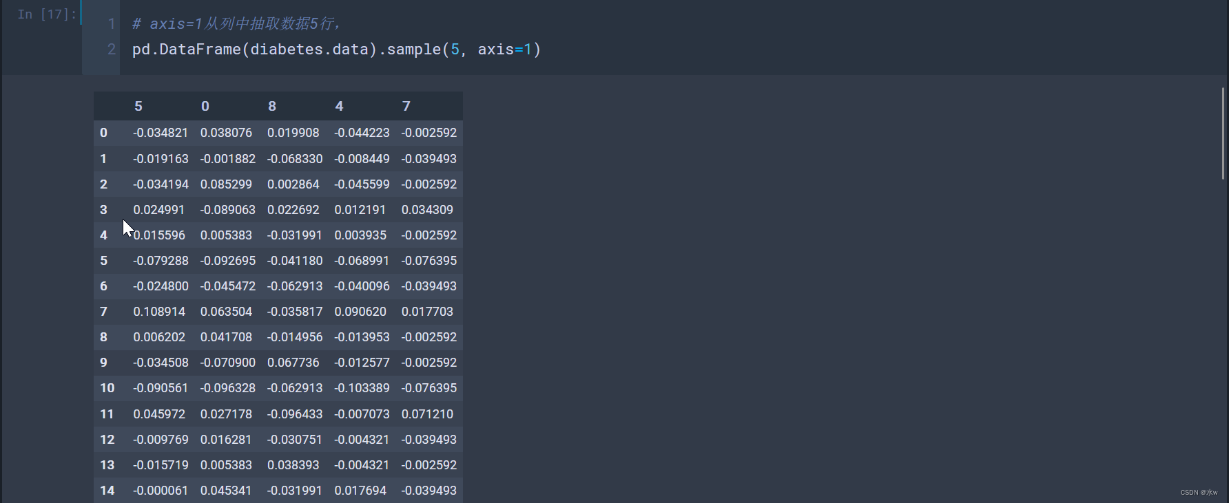 - axis: 整数型或字符串,默认axis=0从行中抽取。axis=0从行中抽取数据,axis=1从列中抽取数据。