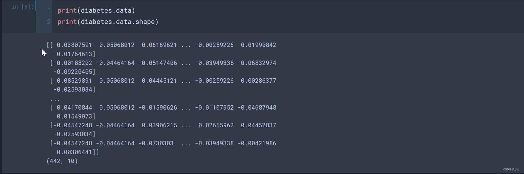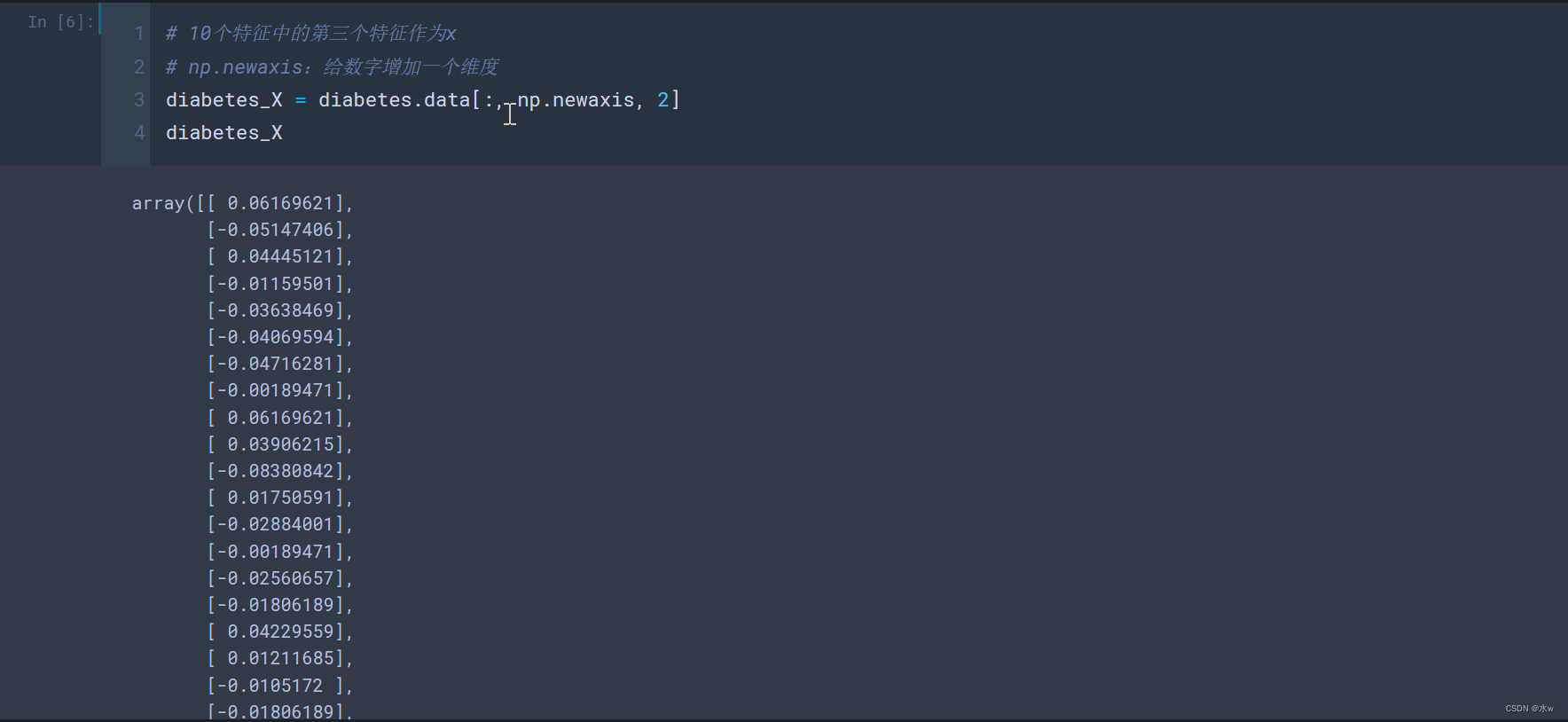 如果我们单取二维数组的某一列的话,就会导致出来的是一维的数组,在切片的时候使用np.newaxis就可以让我们取出来的数组还是二维数组(442, 1)。