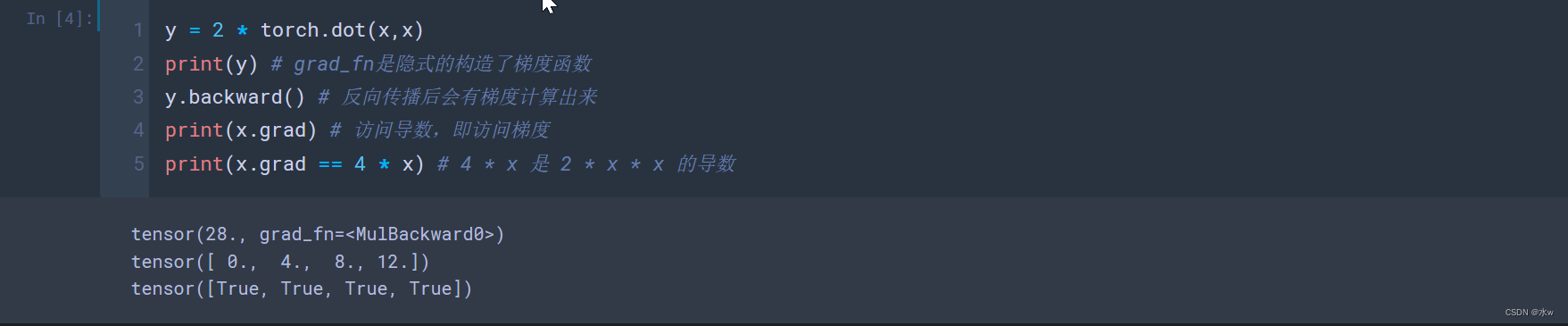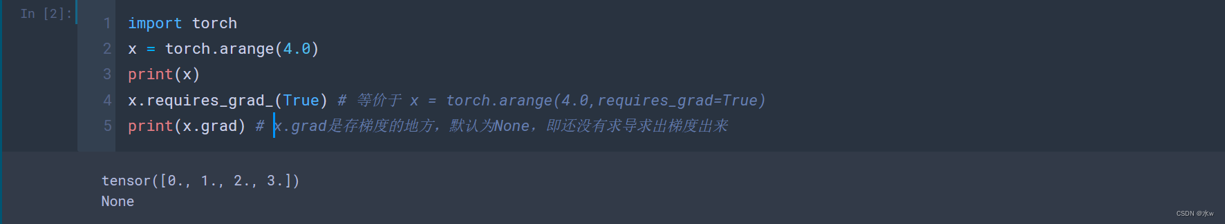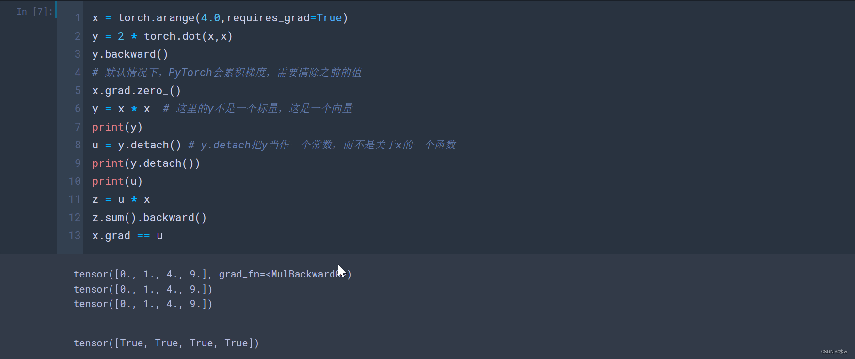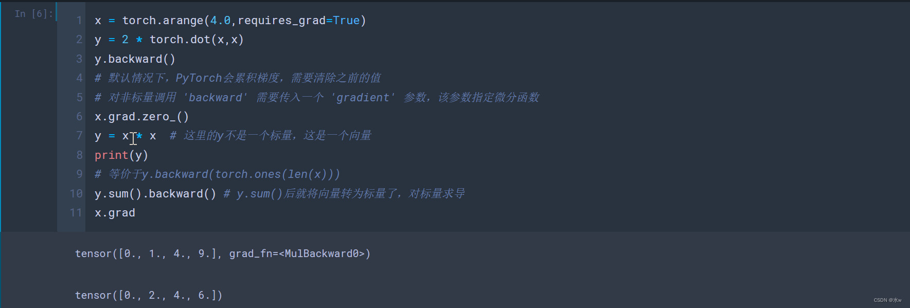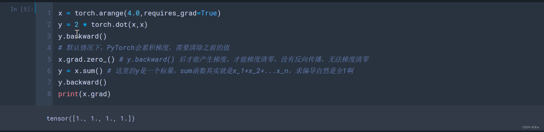 其中,y.sum().backward():我们一般会对y进行求和y.sum()后,就将向量y转为标量了,对标量求导。