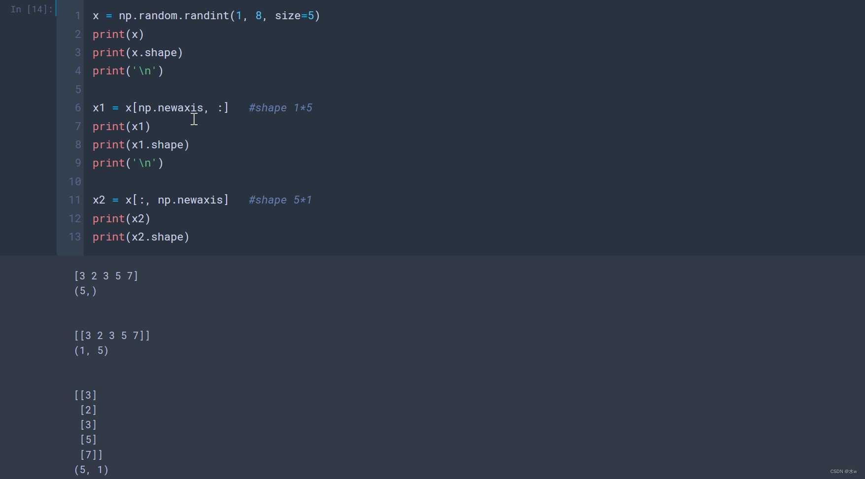 np.newaxis:np.newaxis 在使用和功能上等价于 None,可以给原数组增加一个维度; np.newaxis放的位置不同,产生的新数组也不同。