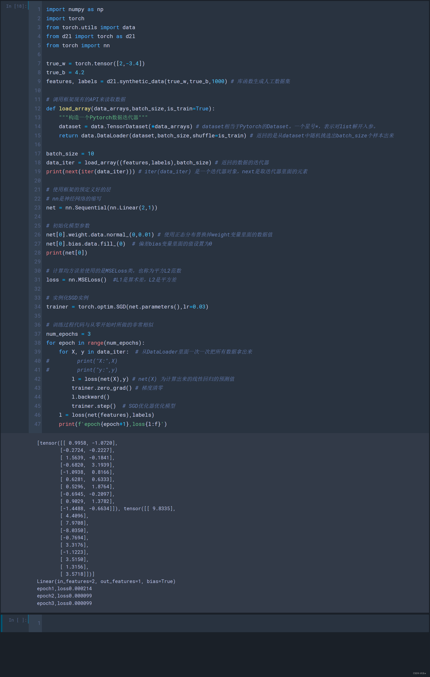 net = linreg # 这里用线性模型,这样写是很方便net赋予其他模型,只需要改一处,不需要下面所有网络模型名称都改