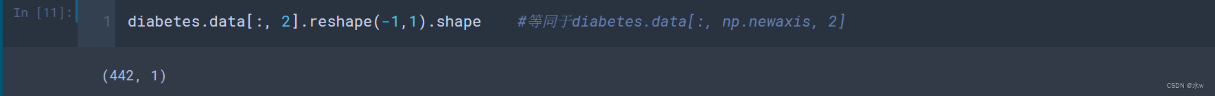 其实,这个np.newaxis方法的功能与.reshape类似,我们要看.reshape(-1,1)里的1所对应的位置为列,-1就代表我不知道它有多少行。无论多少行,我只要保证列数是1列。得到的也是二维数组(442, 1)。