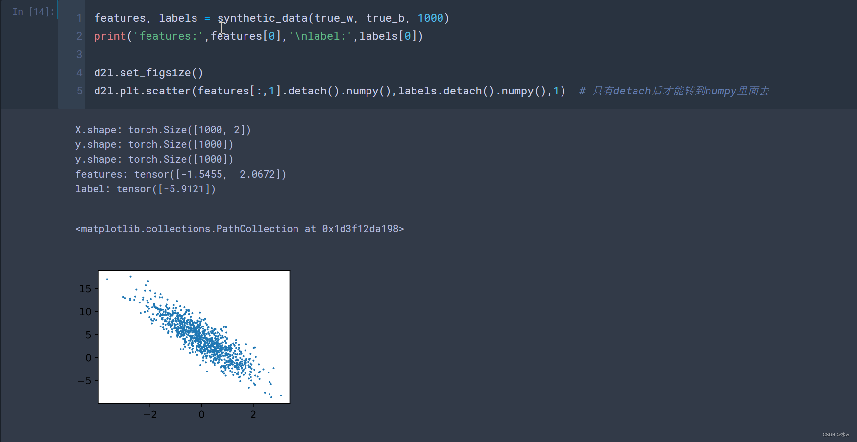 features, labels = d2l.synthetic_data(true_w,true_b,1000) # 库函数生成人工数据集