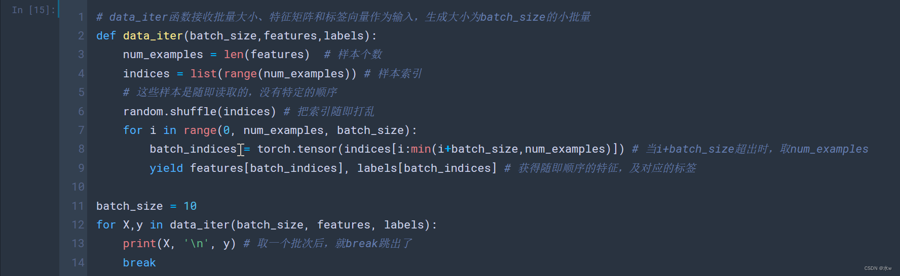 batch_indices = torch.tensor(indices[i:min(i+batch_size,num_examples)]) # 当i+batch_size超出时,取num_examples