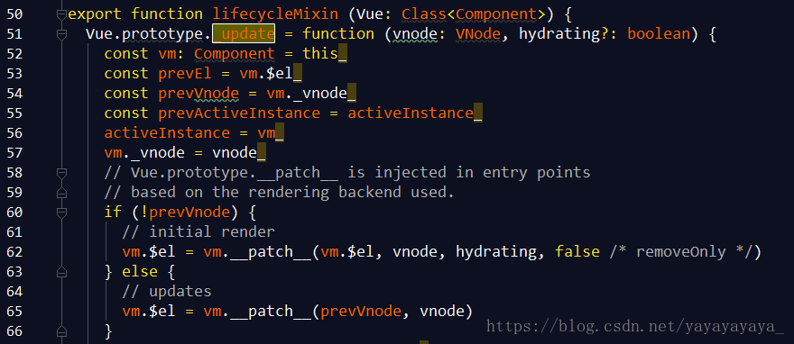 首先,可以看到在'src/core/instance/lifecycle.js'中在Vue原型上定义了私有方法_update,在整个函数中,最重要的部分是执执行__patch__函数。在初始换渲染的阶段,向__patch__函数中传入了四个参数值。