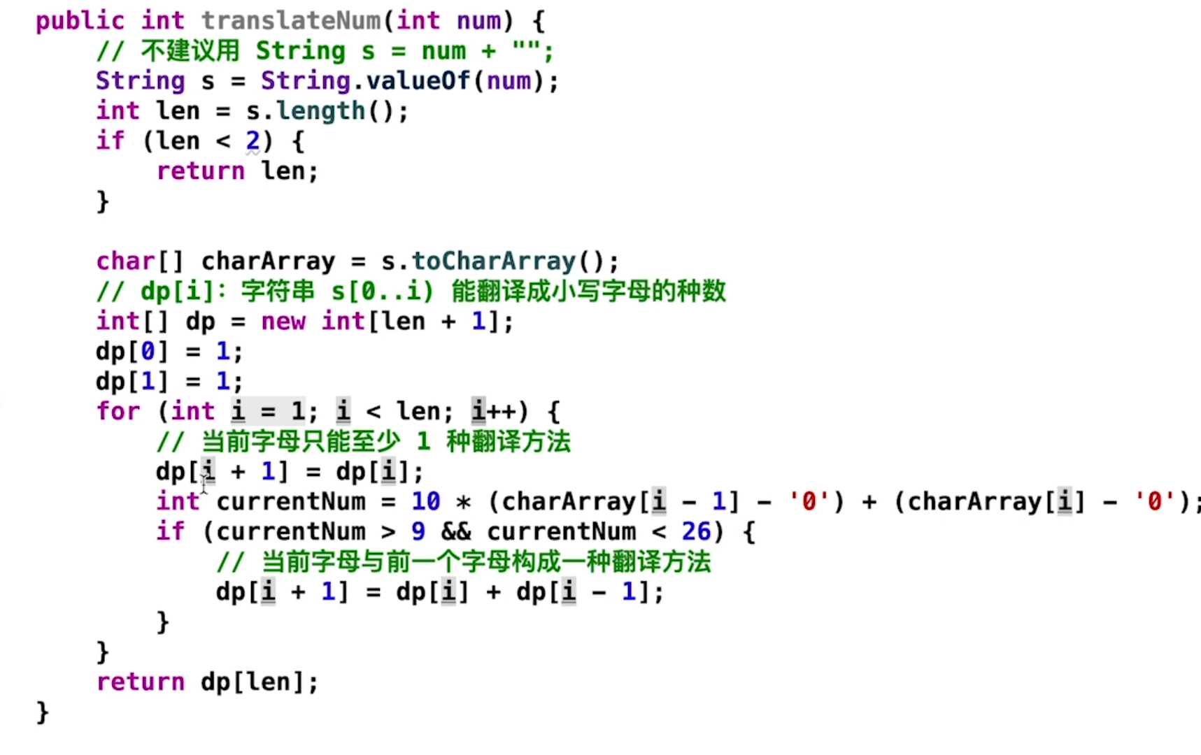 // s[(i-1)..i]<26 没考虑>9 0开头也不可译! 注意考虑i=1的情况->dp[i-2]越界