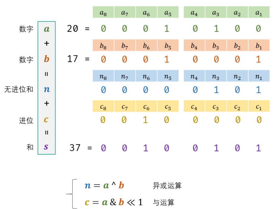 // 无进位和n=a^b 进位c=a&b<<1 和s=n+c(不能出现+->重复前面a+b的方法直到c=0)
