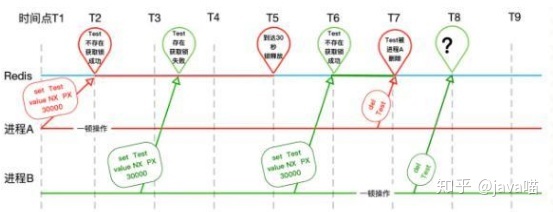 进程B在T6开开心心拿到锁不到一会,进程A操作完成,回手一个del,就把锁释放了。