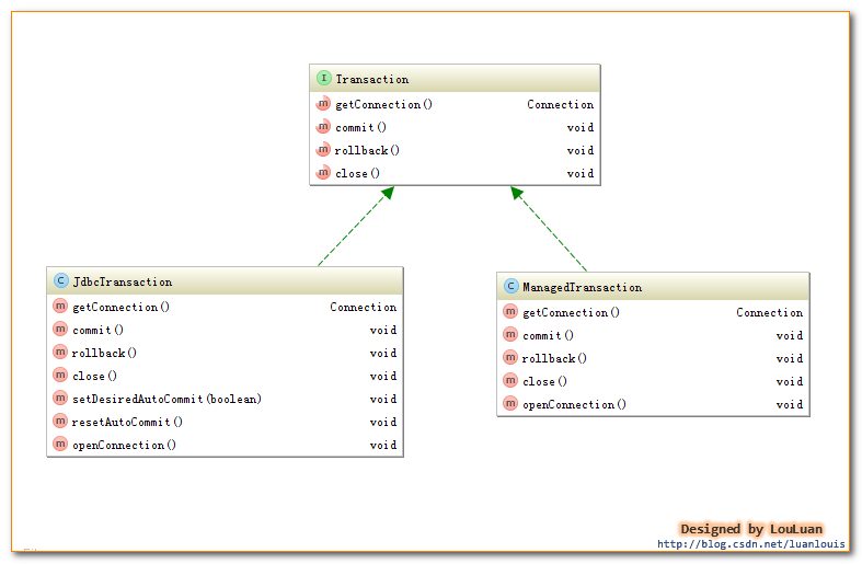 public class JdbcTransactionFactory implements TransactionFactory { public void setProperties(Properties props) { } /** * 根据给定的数据库连接Connection创建Transaction * @param conn Existing database connection * @return */ public Transaction newTransaction(Connection conn) { return new JdbcTransaction(conn); } /** * 根据DataSource、隔离级别和是否自动提交创建Transacion * * @param ds * @param level Desired isolation level * @param autoCommit Desired autocommit * @return */ public Transaction newTransaction(DataSource ds, TransactionIsolationLevel level, boolean autoCommit) { return new JdbcTransaction(ds, level, autoCommit); } }如上说是,JdbcTransactionFactory会创建JDBC类型的Transaction,即JdbcTransaction。类似地,ManagedTransactionFactory也会创建ManagedTransaction。下面我们会分别深入JdbcTranaction 和ManagedTransaction,看它们到底是怎样实现事务管理的。