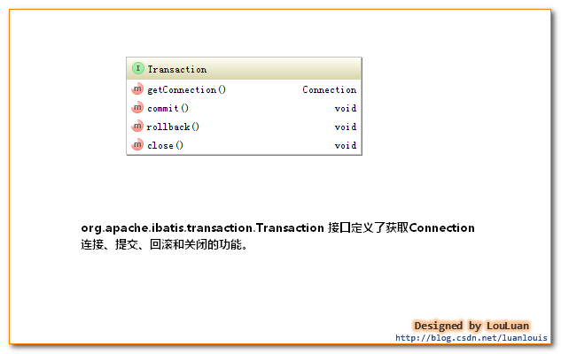 对数据库的事务而言,应该具有以下几点:创建(create)、提交(commit)、回滚(rollback)、关闭(close)。对应地,MyBatis将事务抽象成了Transaction接口:其接口定义如下: