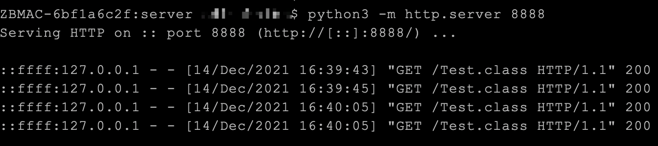 然后我们在该目录执行python3 -m http.server 8888,在端口8888上基于该目录启动一个简单的http服务。当我们访问http://localhost:8888/Test.class的时候,该服务就会返回该目录下对应的Class文件。