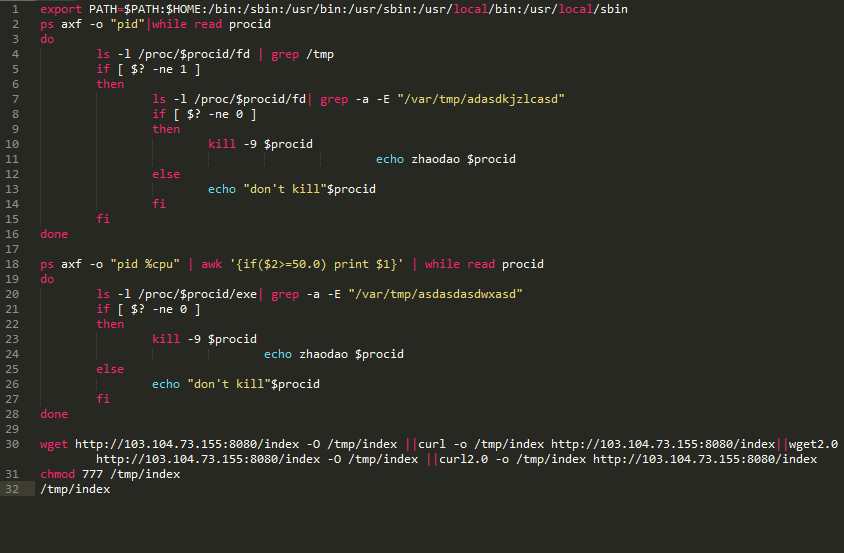 以下shell script dropper可从http://103.104.73.155:8080/index上下载UPX packed Go二进制文件。此二进制文件也是一种XMRig加密货币挖矿软件。