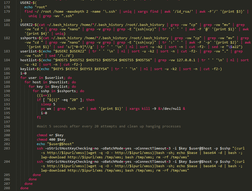图5. M8220正试图通过SSH进行扩散:通过解析用户文件夹和命令历史,获取用户名、密码和SSH钥匙。
