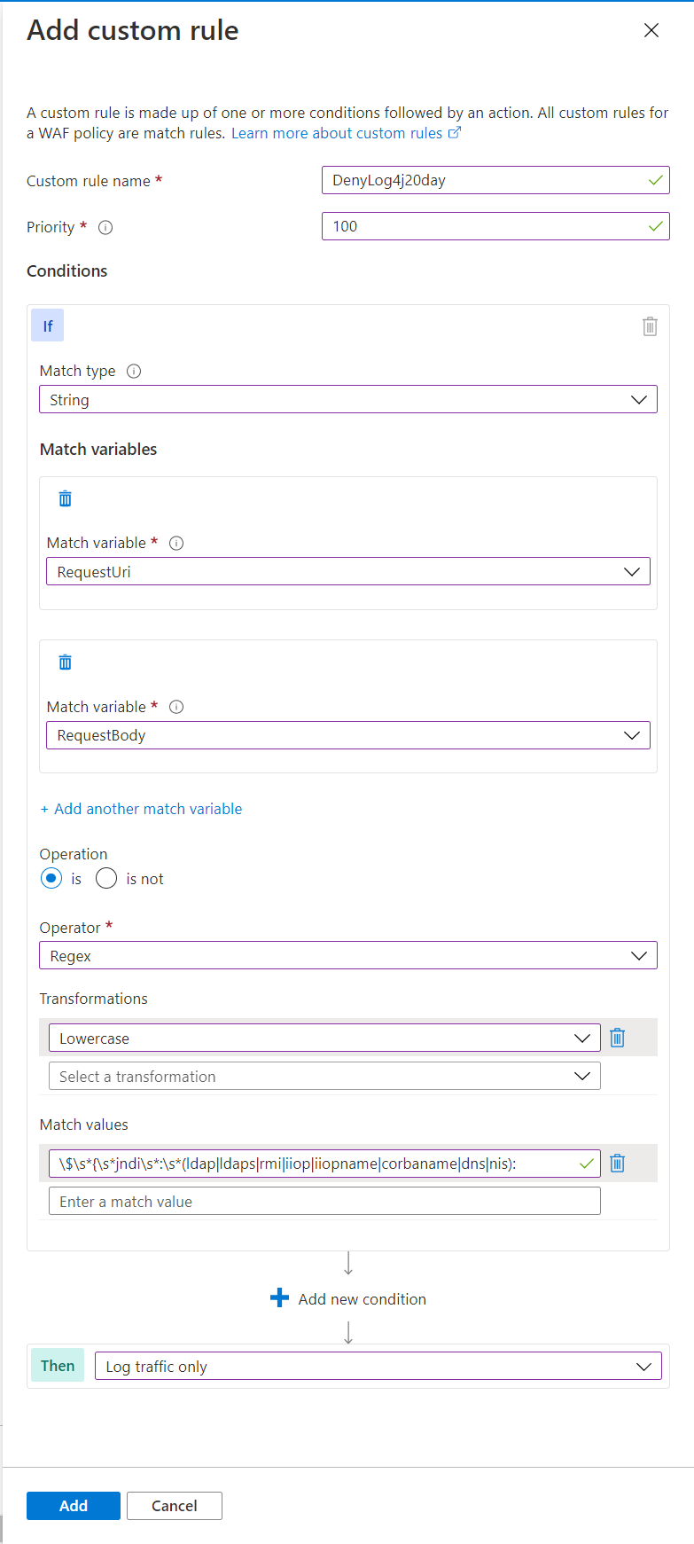 | • Custom rule name: DenyLog4j20day • Match Type: String • Match variable: RequestBody, RequestUri • Operation: Is • Operator: Regex • Transformations: Lowercase • Match Values: $s*{s*jndis*:s*(ldap|ldaps|rmi|iiop|iiopname|corbaname|dns|nis): • Then: Log traffic only – for test first |